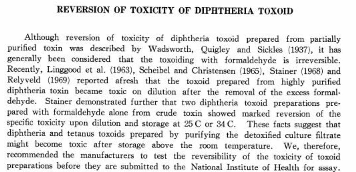 Diphtheria toxoid is made by treating the diphtheria toxin with formaldehyde. In the absence of formaldehyde, or under improper storage conditions, the toxoid can revert back to toxin. In very small amounts, the toxin takes longer to cause symptoms, so diphtheria toxin illness from vaccines may be outside the typical window for adverse events. Read that first report.