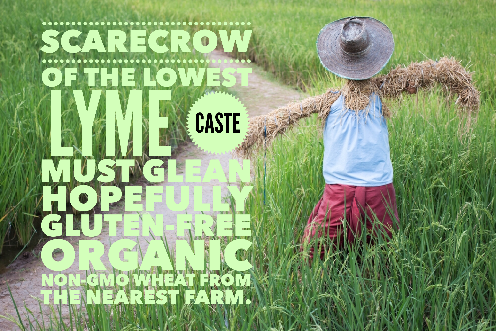 God forbid the nearest farm only grows GMO corn, or wheat full of Satan’s gluten. It would suck to trudge all the way home with your pockets full of wheat, looking exactly like the Scarecrow with AIDS, stumbling down the road, then grind your wheat into flour with your bare hands so you can make it into a loaf of organic bread, just to find out that he farmer lied about the gluten it isn’t organic after all.