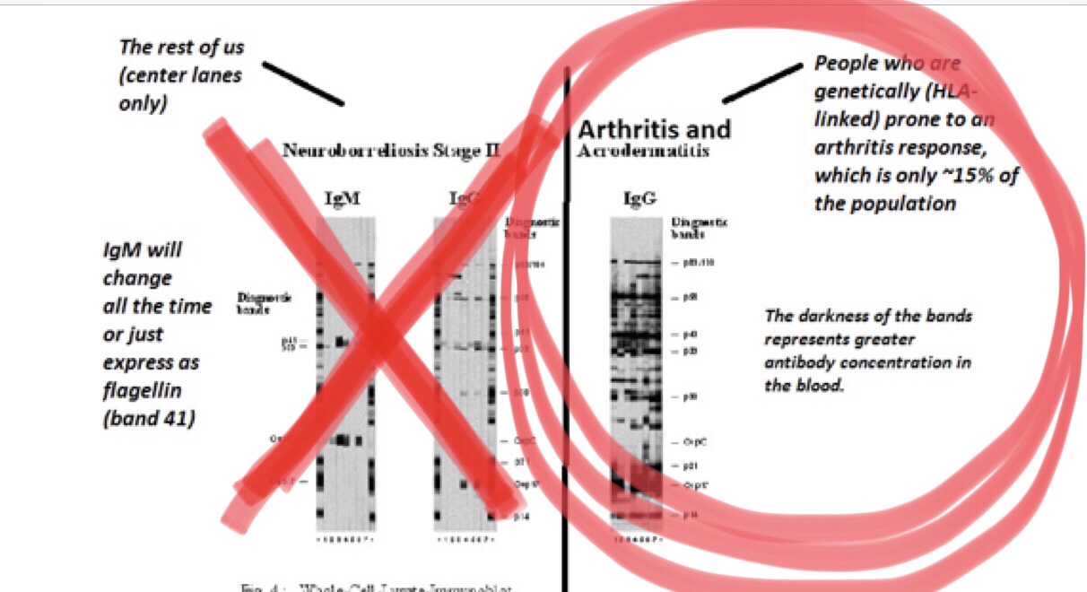 An additional benefit that this change will confer to the crooks is that we’ll no longer have access to our Western blot bands. Over the years, many of the crooks/CDC officers have published that one band or another is diagnostic of the disease. Throwing out theWestern blot as the second tier helps them pretend that they never said those things. Most of us know that all you really need for diagnosis is band 41, for flagellin antibody. Will the masses be more complacent and compliant for our masters if we aren’t allowed this bit of information?