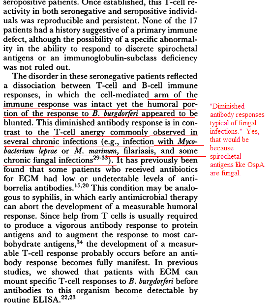They also noted a dissociation between T and B cell responses, with a blunted B cell response, which led them to develop a T cell assay for diagnosis of “seronegative” cases. Allen Steere later used this “seronegative Lyme assay” in his own research.