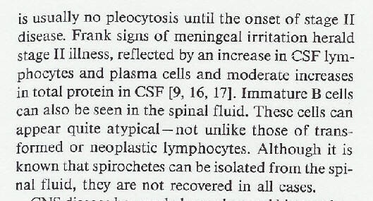 “The second-stage neurologic disorders may appear suddenly a few weeks after appearance of ECM or advance insidiously over months (82, 84,129,142, 145, 168). Approx- imately 30 to 40% of patients with disease progressing beyond ECM have neurologic complaints. In the early stages there may be clinical and laboratory evidence of meningeal iritation; in endemic areas B. burgdorferi is a common etiology of “aseptic meningitis.” Later a meningoradiculopathy with a lymphocytic pleocytosis and oligoclonal peaks in the cerebrospinal fluid(CSF) may come to the fore; this constellation has been termed lymphocytic meningoradiculitis or Bannwarth’s syndrome (82,84,145). Patients typically complain of headache and sharp pains in the trunk or extremities; there may be sensory and motor deficits as well. Unilateral or bilateral Bell’s palsy is often present, either by itself or associated with the radiculopathy. Some patients with chronic meningitis complain only of headache and extreme fatigue. During second-stage neurologic disease there may be evidence of encephalitis with altered mental status and diffuse slowing on the electroencephalogram. In the third stage of the disease, years after onset of infection, patients may present with such signs of diffuse or local cortical involvement as intellectual deterioration, hemiparesis, or unaccountable psychiatric abnormalities (3).