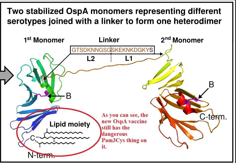 Stricker could not be reached for comment, so we are unable to clarify whether, by “safety concerns,” he means the basic concept from organic chemistry of structure predicting function, whereby a fungal type antigen such as OspA, known by its chemical name “tripalmitoyl cysteine”, or “Pam3Cys” can reliably be expected to have the same biologic action no matter what organism (or fake vaccine) delivers it to the human victim.