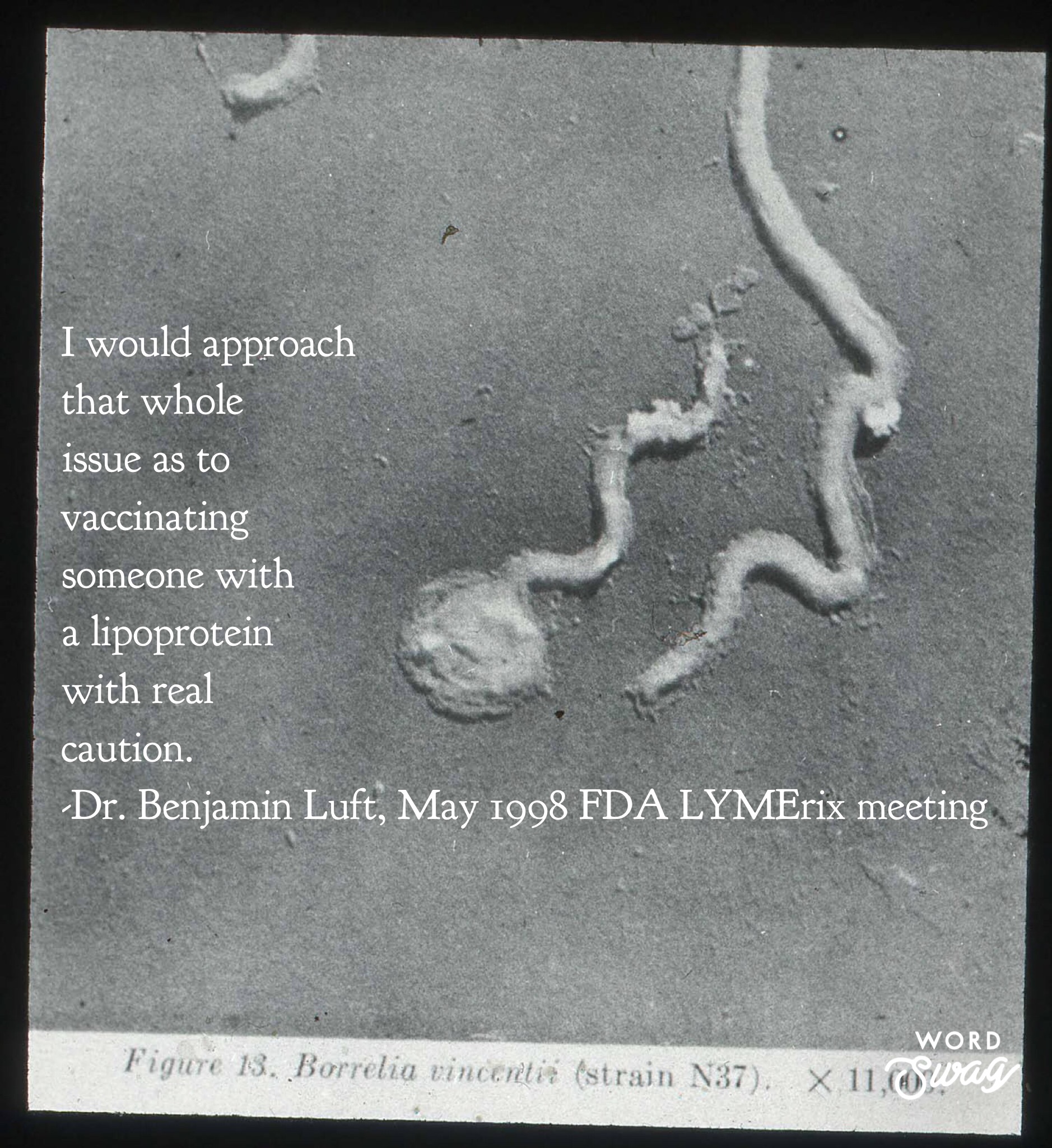 He referred to a quote from Dr. Ben Luft at a 1998 FDA LYMErix meeting: “I would approach that whole issue as to vaccinating someone with a lipoprotein with real caution.”